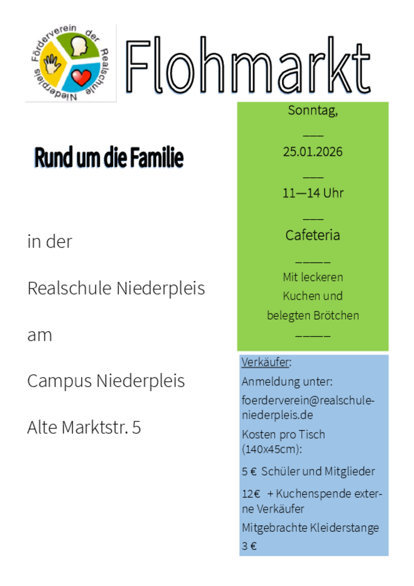 AdresseRealschule NiederpleisAlte Markstraße 5, 53757 Sankt AugustinWir veranstalten wieder einen Flohmarkt Rund um die Familie. Der Flohmarkt findet in der Aula der Realschule statt. Die..weitere InformationenWir veranstalten wieder einen Flohmarkt Rund um die Familie. Der Flohmarkt findet in der Aula der Realschule statt.Details & Kontakt