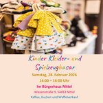 AdresseBürgerhaus NittelWiesenstrasse 9, 54453 NittelKinder Kleider- und Spielzeugbasar am 28.02.2026 von 14-16 Uhr im Bürgerhaus Nittel. Parkmöglichkeiten vor Ort..weitere InformationenKinder Kleider- und Spielzeugbasar am 28.02.2026 von 14-16 Uhr im Bürgerhaus Nittel. Parkmöglichkeiten vor Ort oder bei Netto/DM. Anmeldung für Tischreservierungen unter fvkitanittel.wixsite.com/nittel/tischreservierung-kleiderbasarDetails