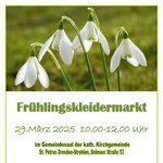 weitere InformationenAnnahme der Kleidung und Spielzeug am 3.4.2020 17-18.00 Uhr im Saal der kath. Kirche St. Petrus DD-Strehlen, Dohnaer St. 53, Annahme pro Verkäufer 2 Klappkisten o.ä., ausgezeichnet und größensortiert, Frühlings- und Sommersachen, 20% des Erlöses gehen an die Veranstalter, Rückgabe der nicht verkauften Sachen und des Erlöses am Samstag 14-14.30 Uhr