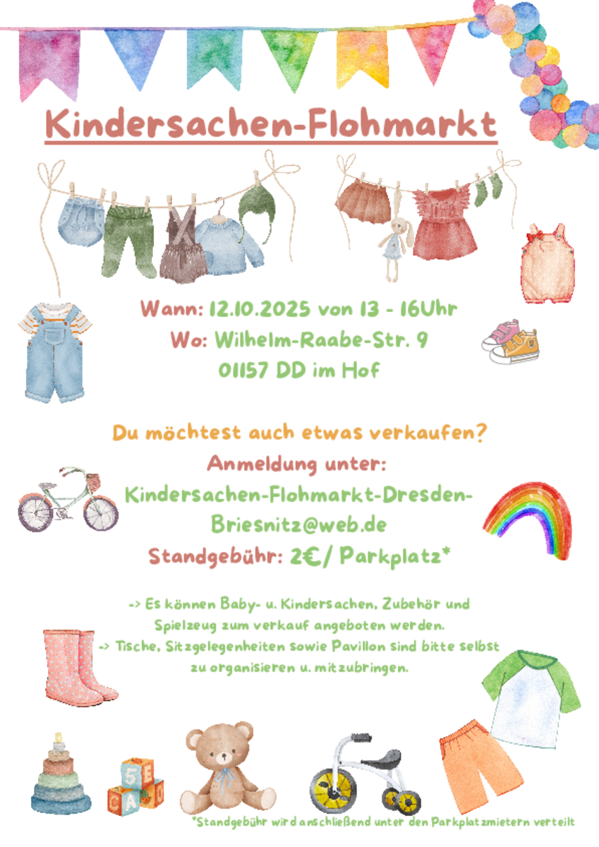 AdresseKindersachen-Hofflohmarkt-BriesnitzWilhelm-Raabe-Str. 9, 01157 Dresden BriesnitzEs wird von Baby-/ - Kinderkleidung, über Spielzeug und Kinderbüchern, bis hin zu praktischen kleinen Alltagsd..Achtung: Dieser Termin wurde leider abgesagt!Details