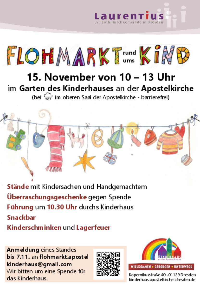 AdresseKinderhaus an der ApostelkircheKopernikusstraße 40, 01129 Dresden (Trachau)Ab 10 Uhr laden wir zu unserem Flohmarkt rund ums Kind ein. Es gibt: Stände von Erwachsenen und Kindern mit Kinders..weitere InformationenAb 10 Uhr laden wir zu unserem Flohmarkt rund ums Kind ein. Es gibt: Stände von Erwachsenen und Kindern mit Kindersachen und Handgemachtem, eine Führung durch das Kinderhaus um 10.30 Uhr für alle Interessierten, Überraschungsgeschenke gegen Spende, eine Snackbar mit Getränken und herzhaften und süßen Speisen, Kinderschminken und Lagerfeuer. Bei gutem Wetter können die Kinder unter Aufsicht auf dem herrlichen Außengelände des Kindergartens spielen. Bei Regen findet der Flohmarkt im oberen Saal der Apostelkirche statt (über eine Rampe barrierefrei).Details & KontaktKontaktAnmeldungen sind ab 15.10. möglich. Bei gutem Wetter findet der Flohmarkt rund ums Kind auf dem Gelände des Kinderhauses statt. Bei Regenwetter in der Apostelkirche. Sollte Regen angekündigt sein, melden wir dies ein paar Tage vorher. Ab 9 Uhr können Sie Ihren Stand aufbauen. Vor der Kirche bzw. dem Kinderhaus gibt es drei Parkplätze, die an diesem Tag für Sie zum Be- und Entladen reserviert sind. Bitte nutzen Sie diese so kurz, wie möglich und suchen sich dann in der Umgebung einen Parkplatz. Am Eingang wird eine Person Sie empfangen, die Ihnen den Platz für Ihren Stand zeigen wird. Den Tisch dafür bringen Sie bitte selbst mit. Er sollte die Länge eines Biertisches (1,70m inklusive Kleiderstange o.ä.) nicht überschreiten. Der Platz ist beschränkt. Ihr Tisch ist in jedem Fall mitzubringen. Im Laufe des Vormittags wird eine Person rumgehen, die die Spende für Ihren Tisch einsammelt. Sie kommt vollständig der Arbeit des Kinderhauses und dem Partnerkindergarten in El Salvador zugute. Von 13 bis spätestens 14.00 Uhr findet der Abbau statt. Wir empfehlen den Verkauf von: • saisonabhängiger Baby- und Kinderbekleidung (Herbst & Winter), Outdoorkleidung • Schuhen • Spielzeug, Büchern, Fahrzeugen • Selbstgemachtem. Das Kinderhaus bzw. die Kirchgemeinde übernimmt keine Haftung im Schadensfall. Schreiben Sie uns gerne bei weiteren Fragen oder Anmerkungen. So hoffen wir auf einen schönen Vormittag, Ihnen einen guten Erlös und viele freudige KäuferInnen.Kontakt mit dem Organisator aufnehmen