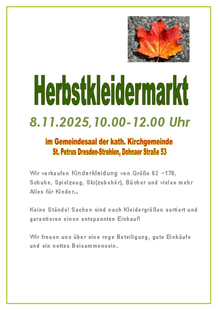 AdresseKath. Kirchgemeinde St. PetrusDohnaer Straße 53, 01219 DresdenWir laden herzlich ein zum Kinderkleidermarkt für Herbst- und Wintersachen, Spielzeug, Schuhe, Skiausrüstung u..weitere InformationenWir laden herzlich ein zum Kinderkleidermarkt für Herbst- und Wintersachen, Spielzeug, Schuhe, Skiausrüstung u.ä.Details & Kontakt