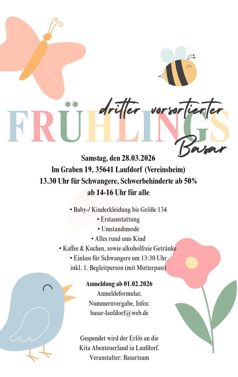 AdresseVereinsheim LaufdorfIm Graben 6, 35641 Schöffengrund LaufdorfUns gibt es auch auf Instagram: basar_laufdorf, schaut doch gerne mal vorbei, bis zum Basartag läuft noch ein tolle..weitere InformationenUns gibt es auch auf Instagram: basar_laufdorf, schaut doch gerne mal vorbei, bis zum Basartag läuft noch ein tolles Gewinnspiel :)Details & Kontakt