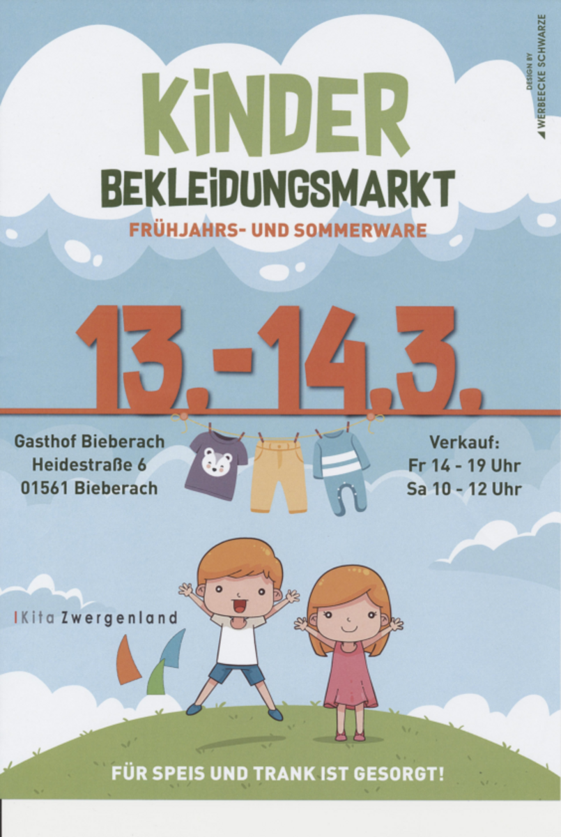AdresseDorfgemeinschaftshaus LampertswaldeOrtrander Straße 2, 01561 Lampertswalde LampertswaldeVosortierte Kinderkleidung, Bücher, Spielzeuge, Schuhe.....weitere InformationenVosortierte Kinderkleidung, Bücher, Spielzeuge, Schuhe...Details & KontaktKontakt mit dem Organisator aufnehmen - Kinderbekleidungsmarkt der Kita ZwergenlandGasthof Bieberach