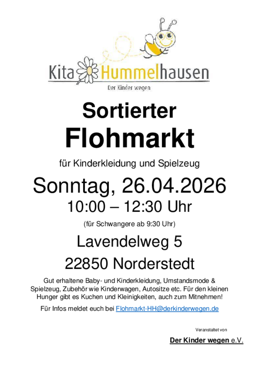 AdresseJUL Kita Luna KidsWilhelm Strauß Weg 6, 21109 Hamburg WilhelmsburgWir veranstalten am Sonntag, den 03.05.2026 in unserer Kita einen Kinderflohmarkt für Kinderkleidung und Spielzeug...weitere InformationenWir veranstalten am Sonntag, den 03.05.2026 in unserer Kita einen Kinderflohmarkt für Kinderkleidung und Spielzeug. Von 10:00-13:00 Uhr kann gestöbert, gefeilscht und verkauft werden.Details & Kontakt