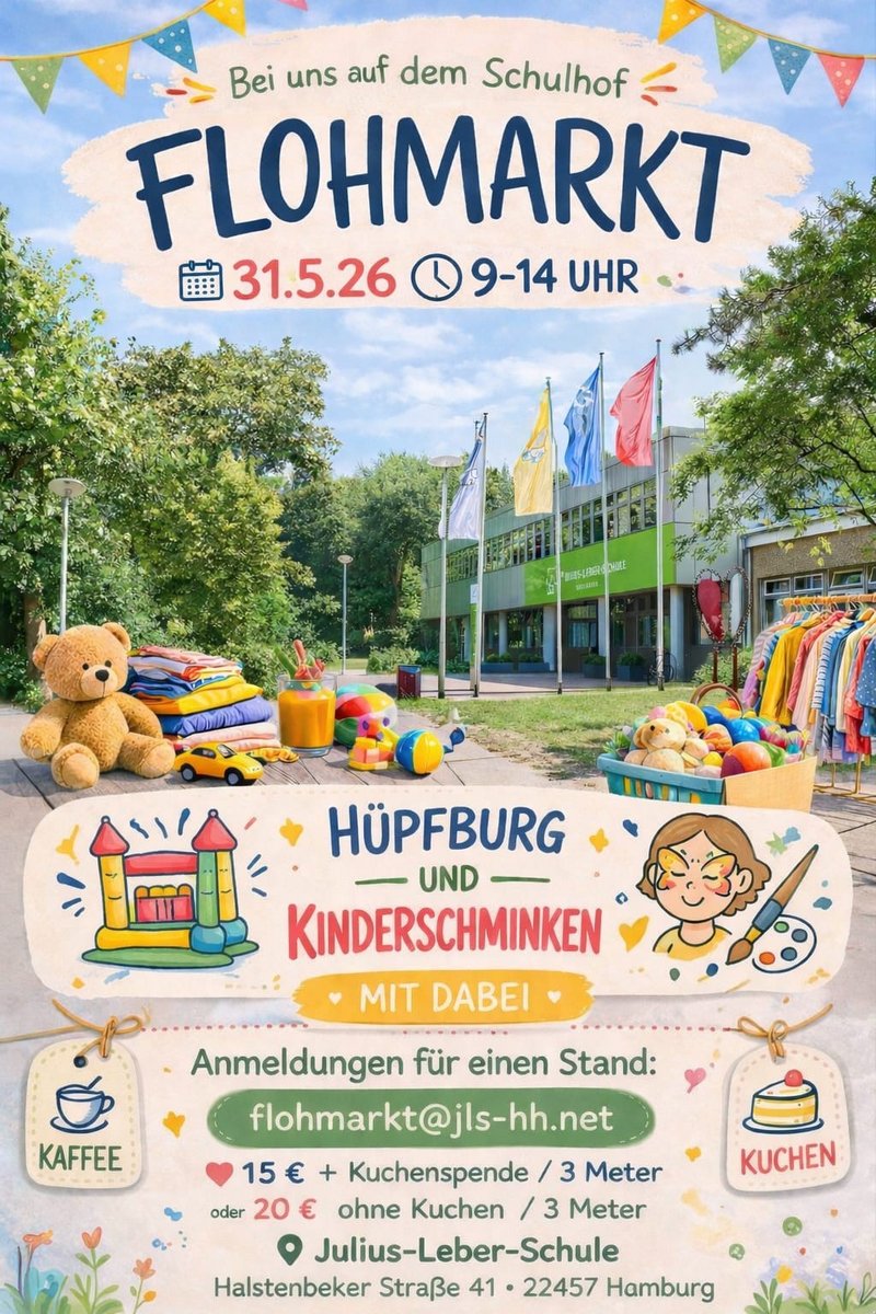 AdresseJulius-Leber-SchuleHalstenbeker Straße 41, 22457 Hamburg SchnelsenEin Fest für Schnelsen! Auf dem großen Außengelände der Julius-Leber-Schule findet am 31. Mai 2026..weitere InformationenEin Fest für Schnelsen! Auf dem großen Außengelände der Julius-Leber-Schule findet am 31. Mai 2026 von 9 bis 14 Uhr der jährliche Familien-Flohmarkt statt - hier ist für alle etwas dabei! Über Kleidung und Trödel bis hin zu einem bunten Kuchenbuffet und Hüpfburg sowie Kinderschminken! Also komm vorbei! Es lohnt sich! Parkplätze sind vor Ort ausreichend vorhanden und mehrere Bushaltestellen befindet sich in unmittelbarer Nähe (z.B. Wogenmannsburg)!Details & Kontakt