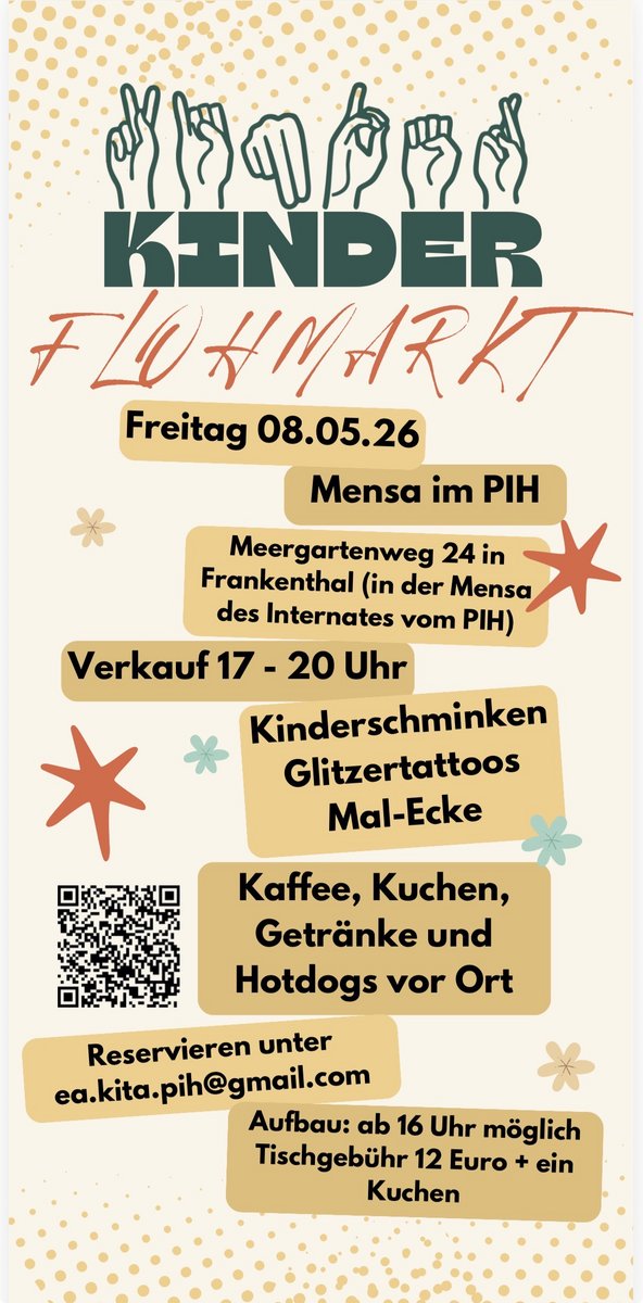 AdresseJona-GemeindesaalViernheimer Weg 222, 68307 BlumenauWir laden euch herzlich zu unserem Kinderflohmarkt „Rund ums Kind“ ein. Am 16.05.26 von 11-14Uhr, Schwa..weitere InformationenWir laden euch herzlich zu unserem Kinderflohmarkt „Rund ums Kind“ ein.Details & Kontakt