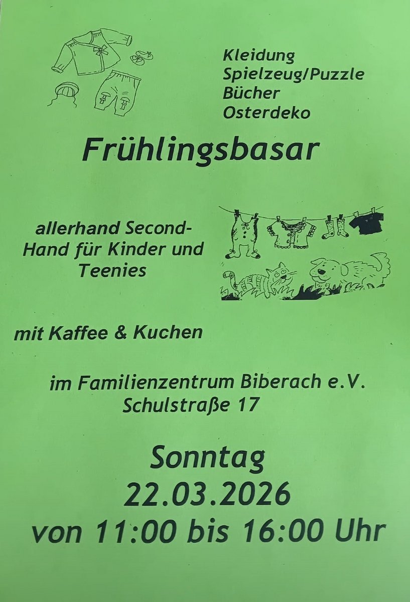 Die Bezahlung ist ausschließlich in bar möglich.KontaktMail: bazar.dreifaltigkeit@gmail.com - Frühlingsbasar im Familienzentrum Biberach e.V.Familienzentrum Biberach e.V.