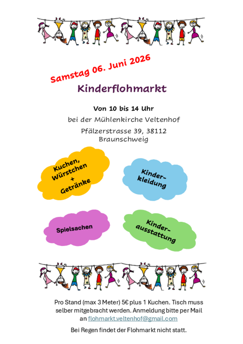 AdresseMühlenkirche VeltenhofPfälzerstraße 39, 38112 Braunschweig VeltenhofDer Kinder-und Babybasar findet auf dem Gelände der Mühlenkirche statt. Stände sind noch verfügbar...weitere InformationenDer Kinder-und Babybasar findet auf dem Gelände der Mühlenkirche statt. Stände sind noch verfügbar.Details & KontaktKontakt mit dem Organisator aufnehmen - KinderkleiderbasarGemeindehaus Rüningen - Gemeindehaus und Außengelände