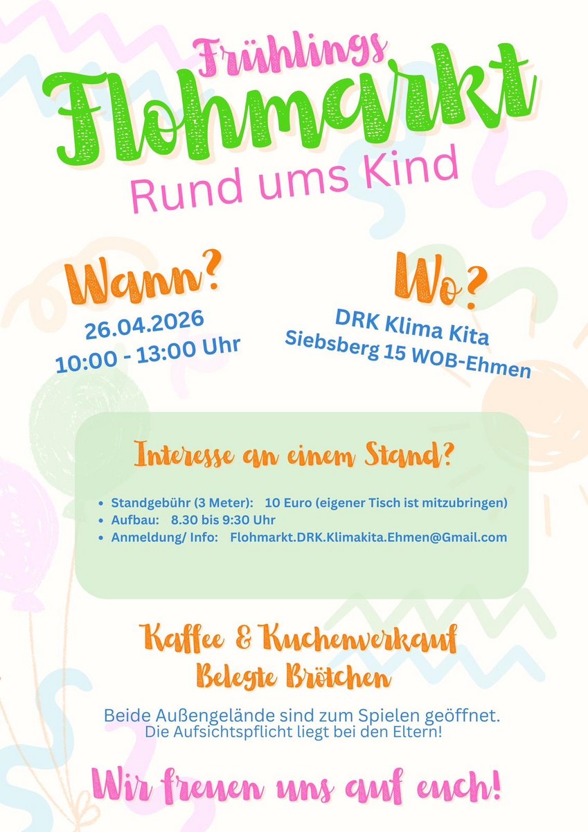 AdresseDRK Klima Kita EhmenSiebsberg 15, 38442 Wolfsburg EhmenHerzliche Einladung zu unserem Frühlingsflohmarkt rund ums Kind! Am 26. April 2026 von 10:00 bis 13:00 Uhr laden w..weitere InformationenHerzliche Einladung zu unserem Frühlingsflohmarkt rund ums Kind!Details & Kontakt